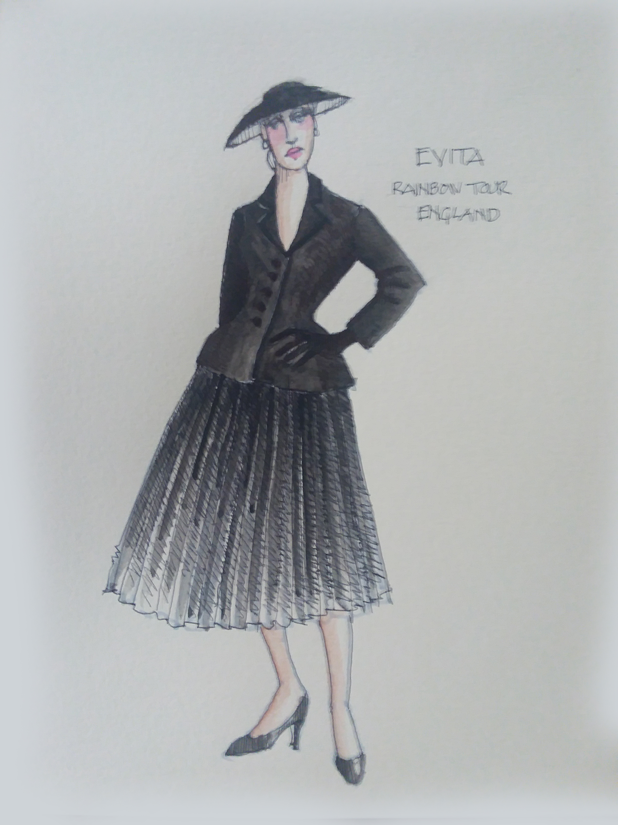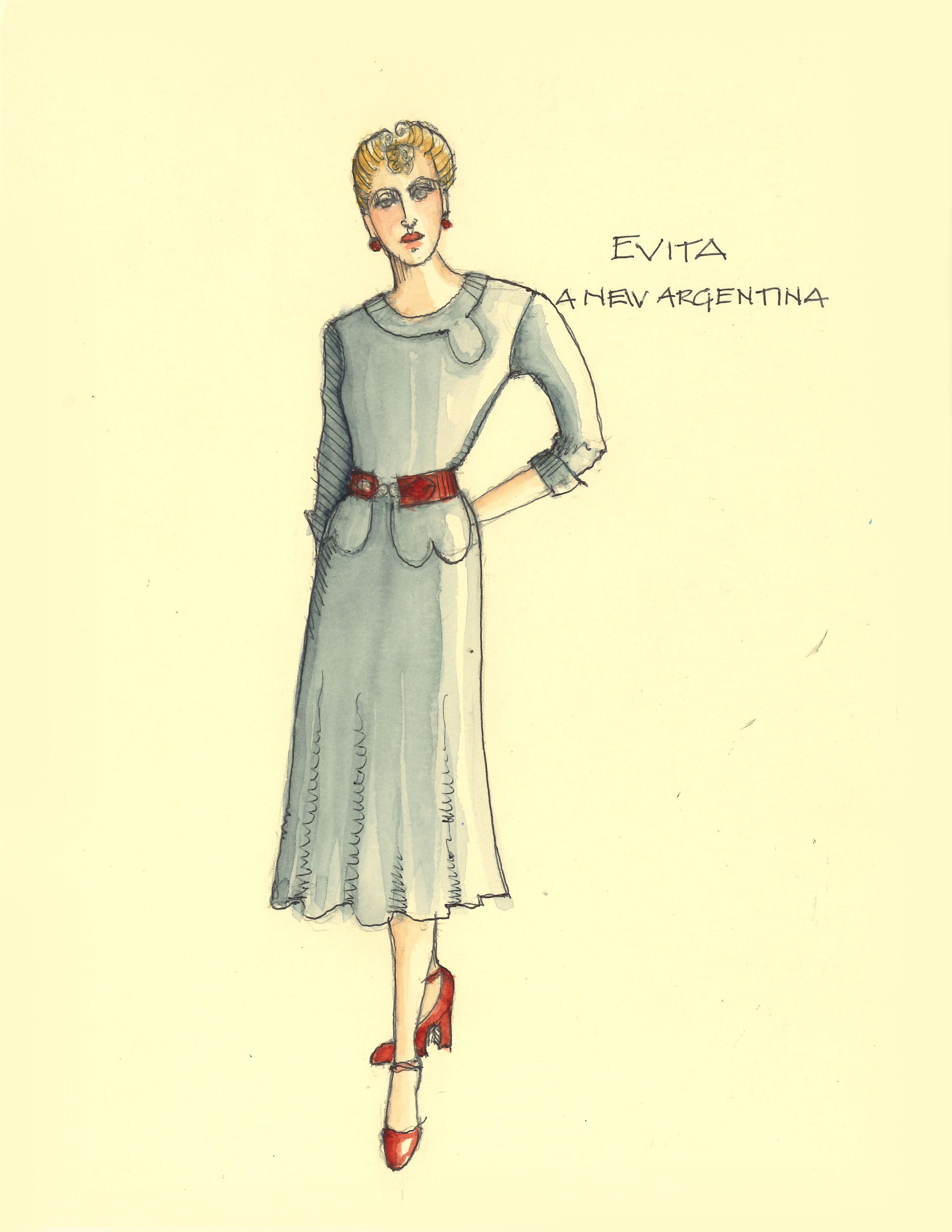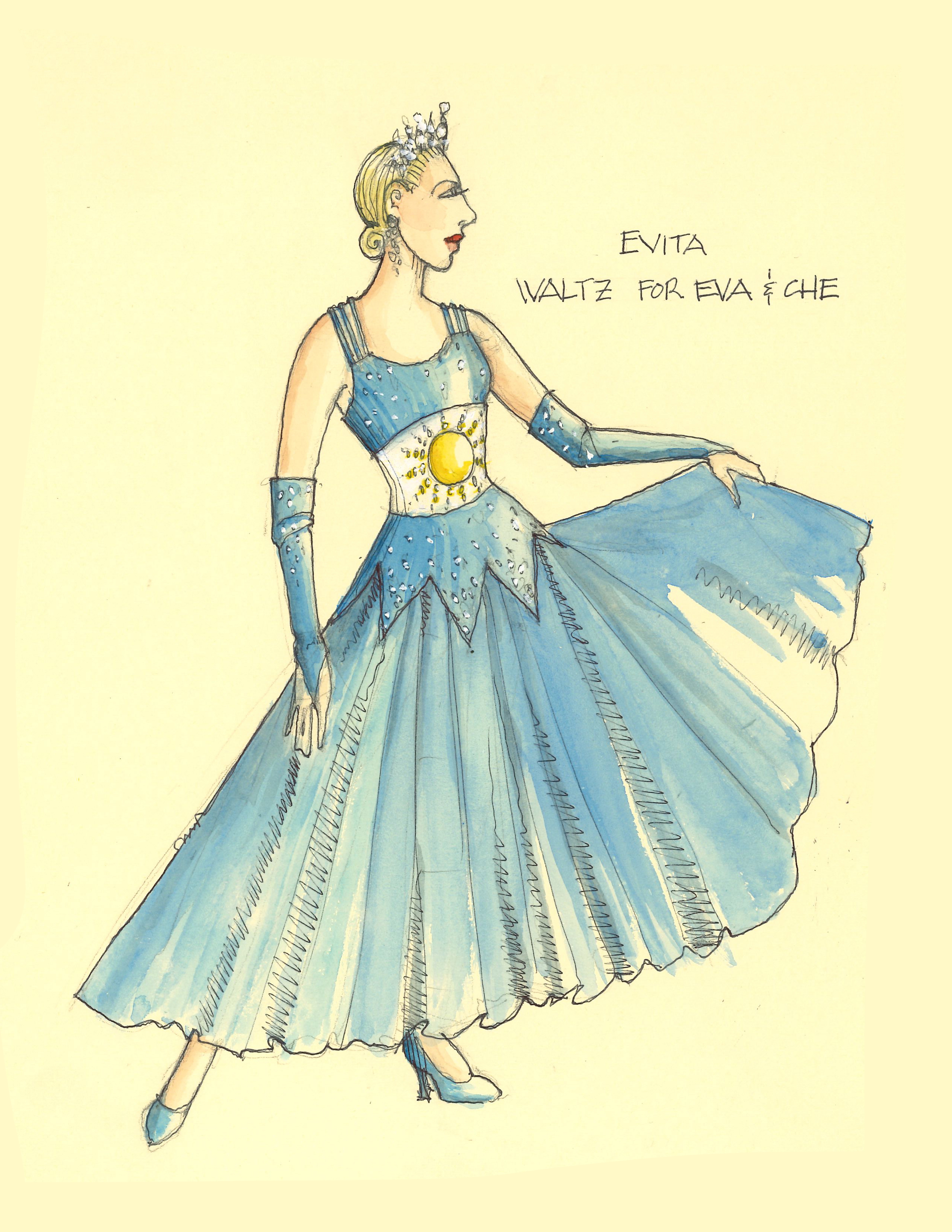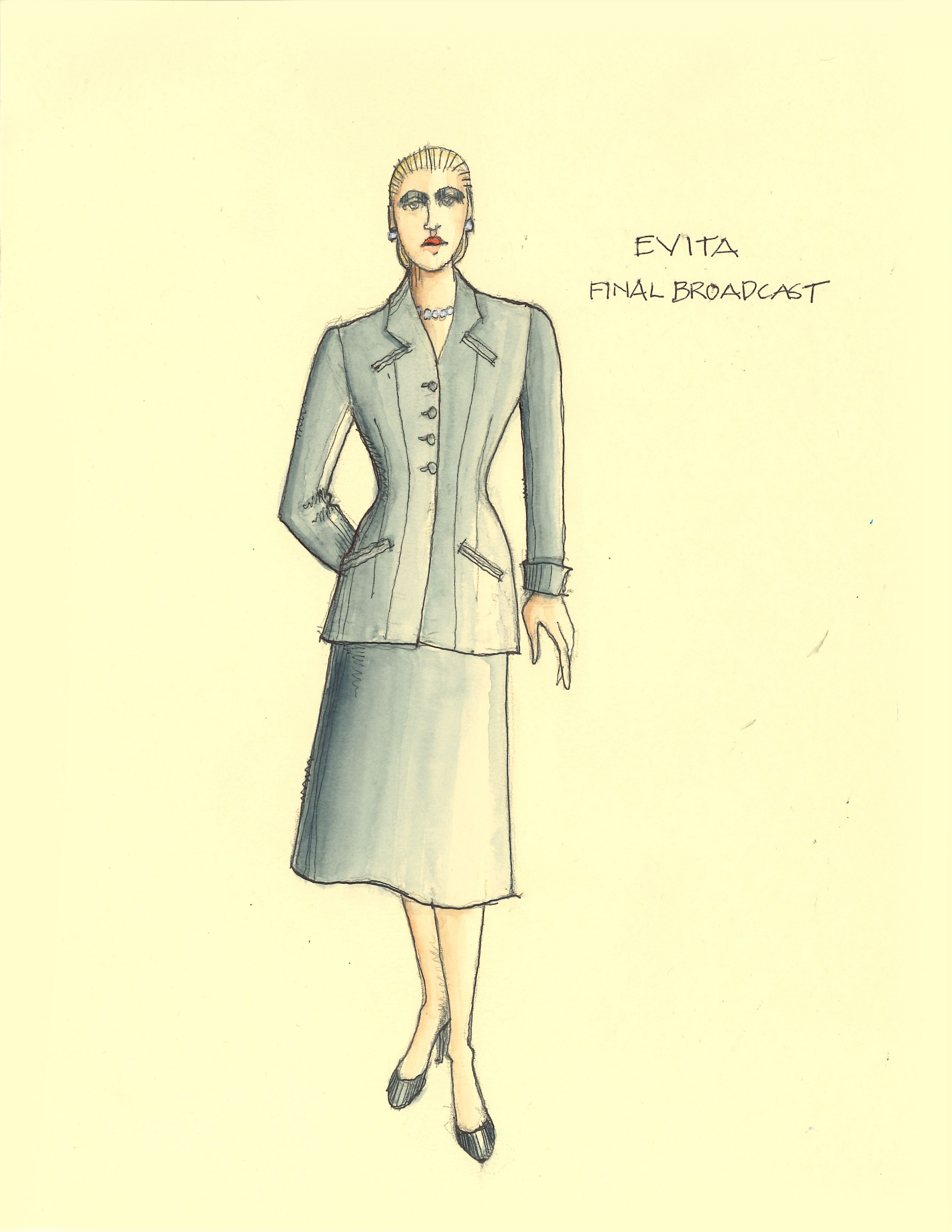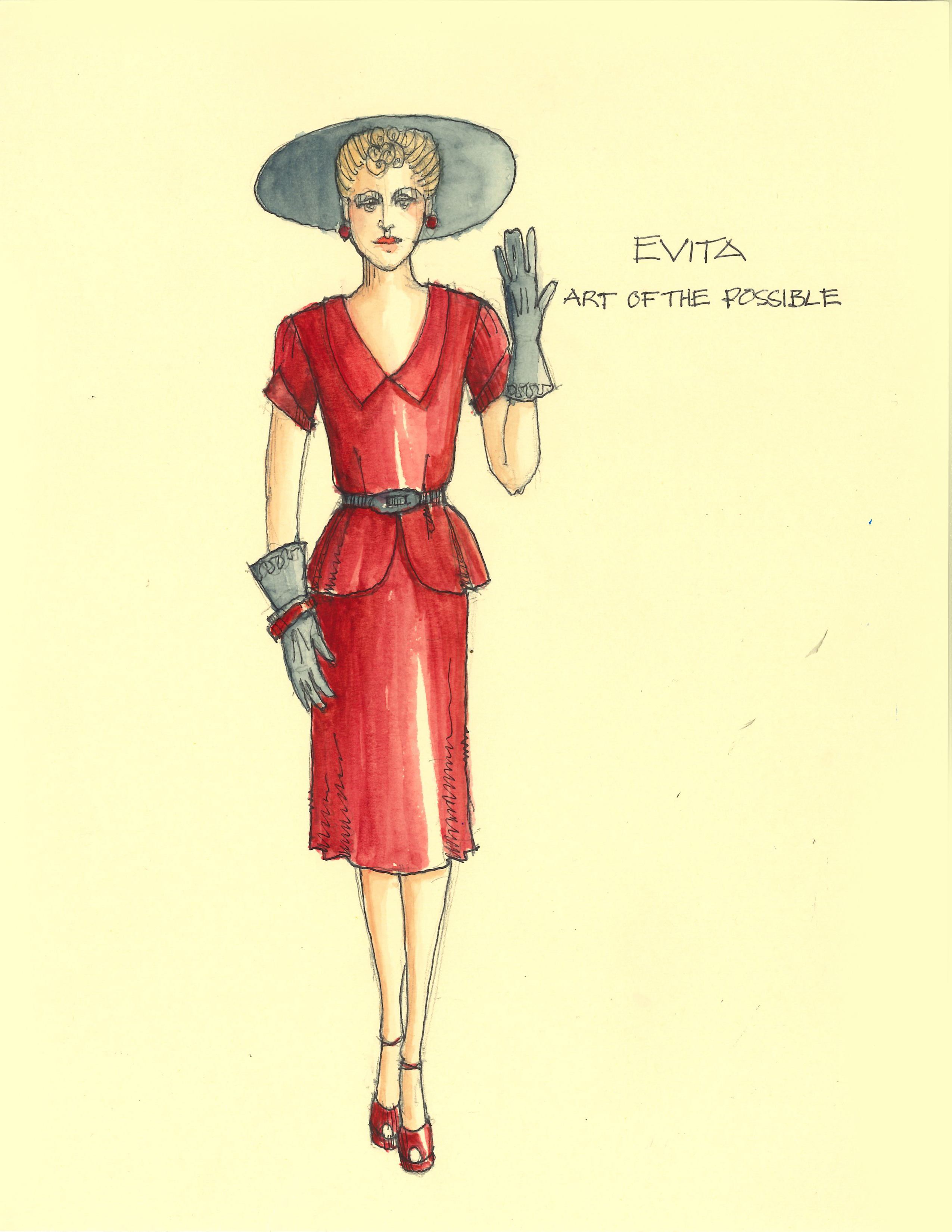 Director Marcia Milgrom Dodge set the opening and closing of Evita in an Argentine Tango Hall. The idea was to present the costumes in a theatrical way. The ensemble first appeared simply dressed in black dresses and black and white period menswear. We added various pieces to these basic costumes to create the different looks needed by the ensemble. The only full change the ensemble had was into all white looks to play the aristocrats. The Rainbow Tour was the most thrilling 5 minutes of my career- we built 4 Bar jackets and Eva changed colors a vista for each country: Red for Spain, Yellow for France, Violet for Italy, and Black for England.