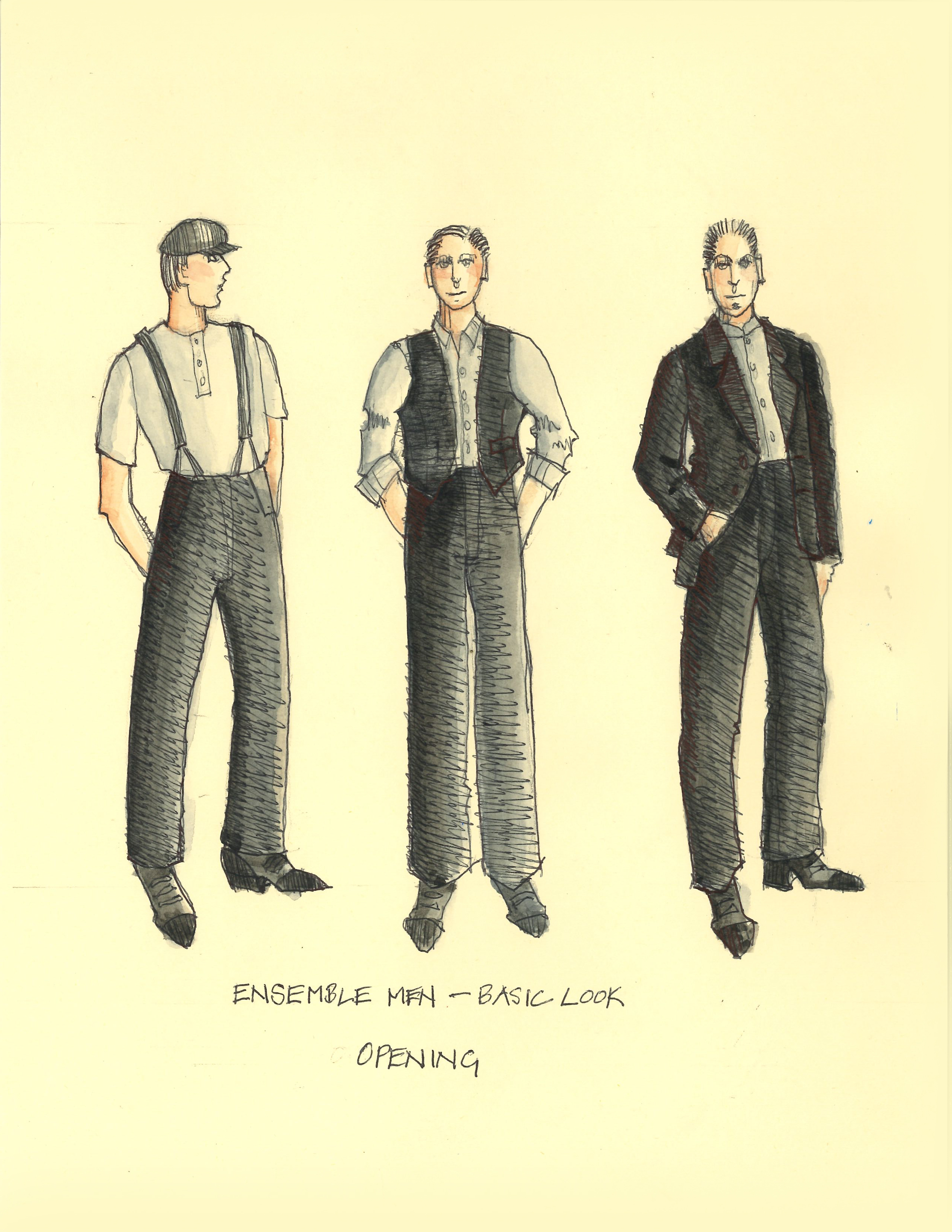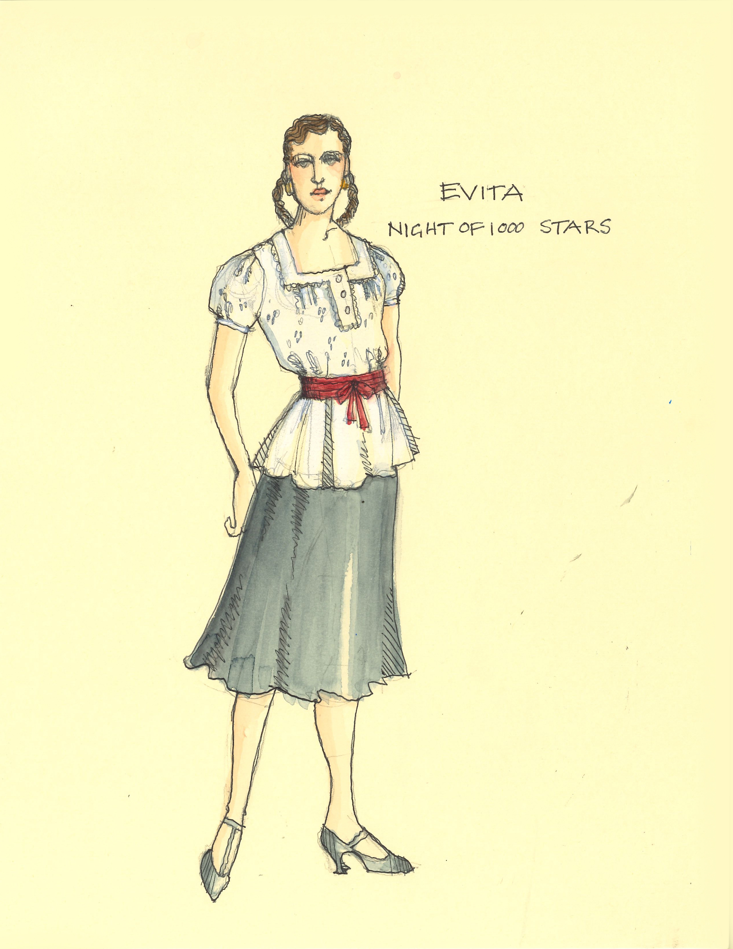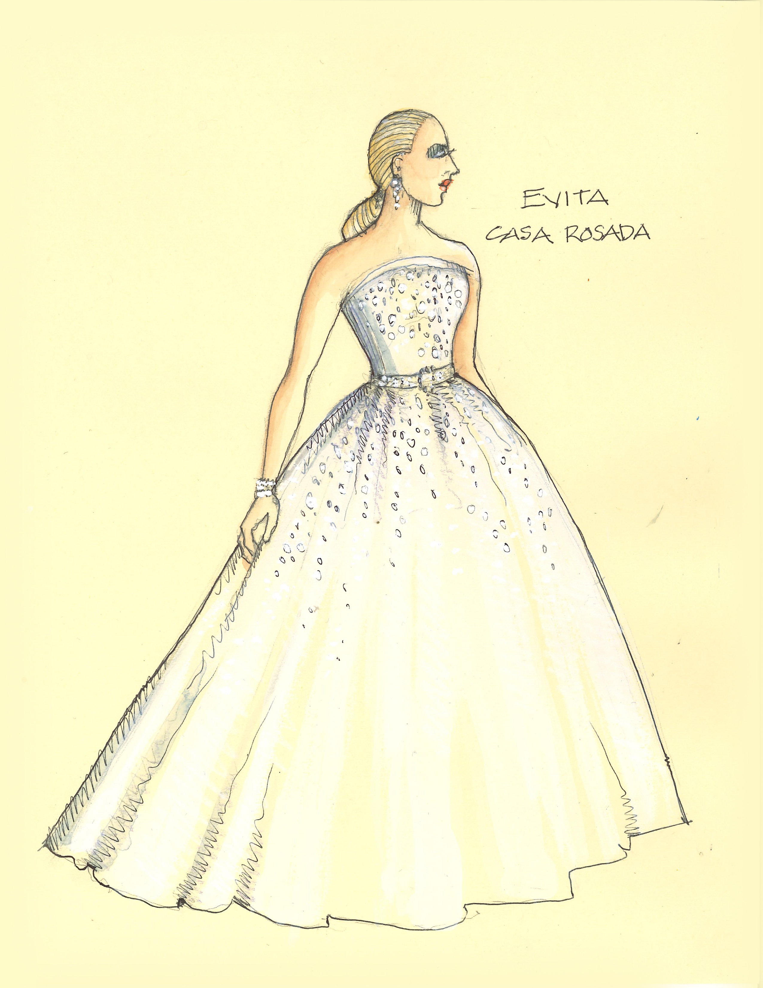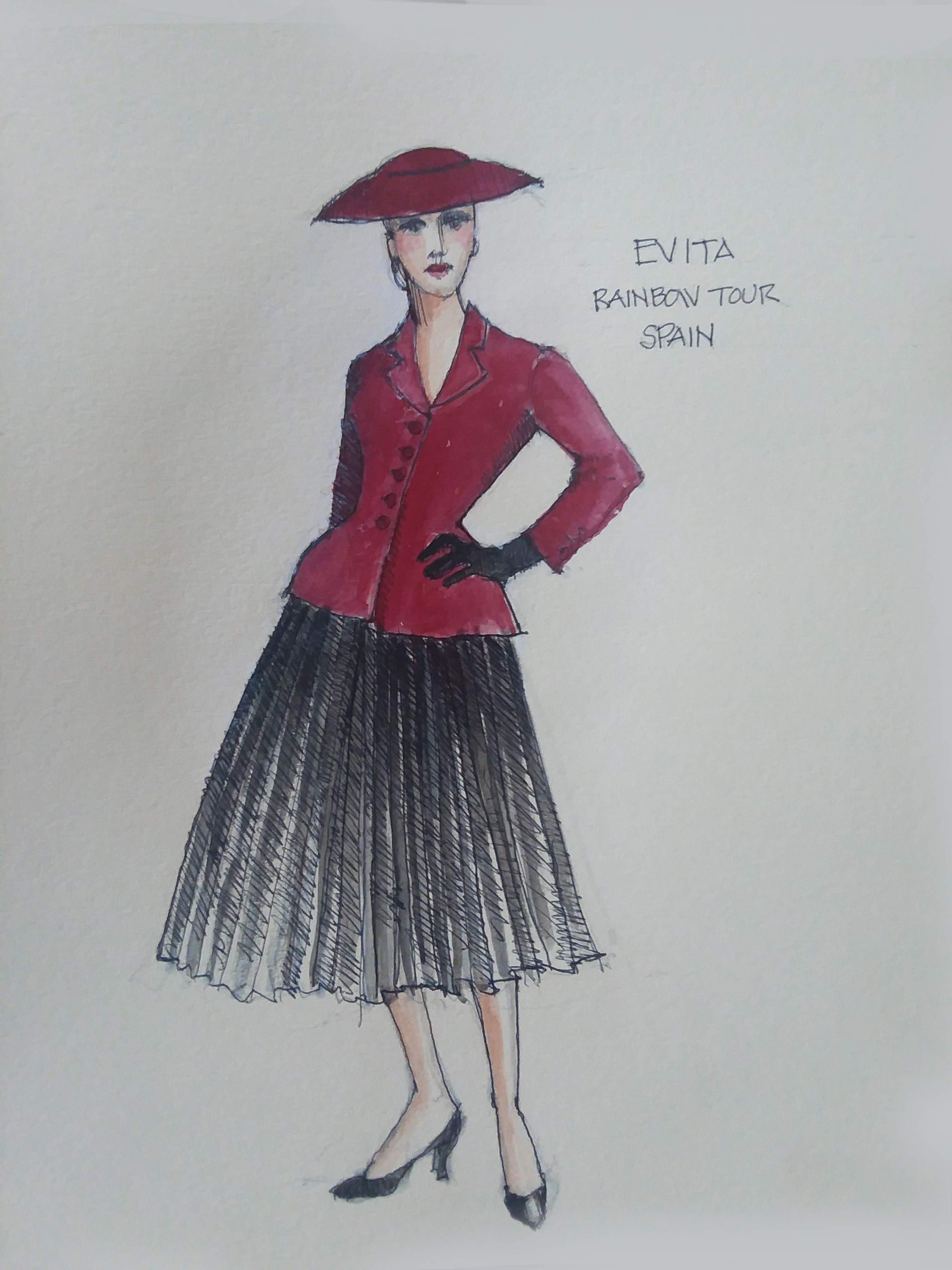 Director Marcia Milgrom Dodge set the opening and closing of Evita in an Argentine Tango Hall. The idea was to present the costumes in a theatrical way. The ensemble first appeared simply dressed in black dresses and black and white period menswear. We added various pieces to these basic costumes to create the different looks needed by the ensemble. The only full change the ensemble had was into all white looks to play the aristocrats. The Rainbow Tour was the most thrilling 5 minutes of my career- we built 4 Bar jackets and Eva changed colors a vista for each country: Red for Spain, Yellow for France, Violet for Italy, and Black for England.