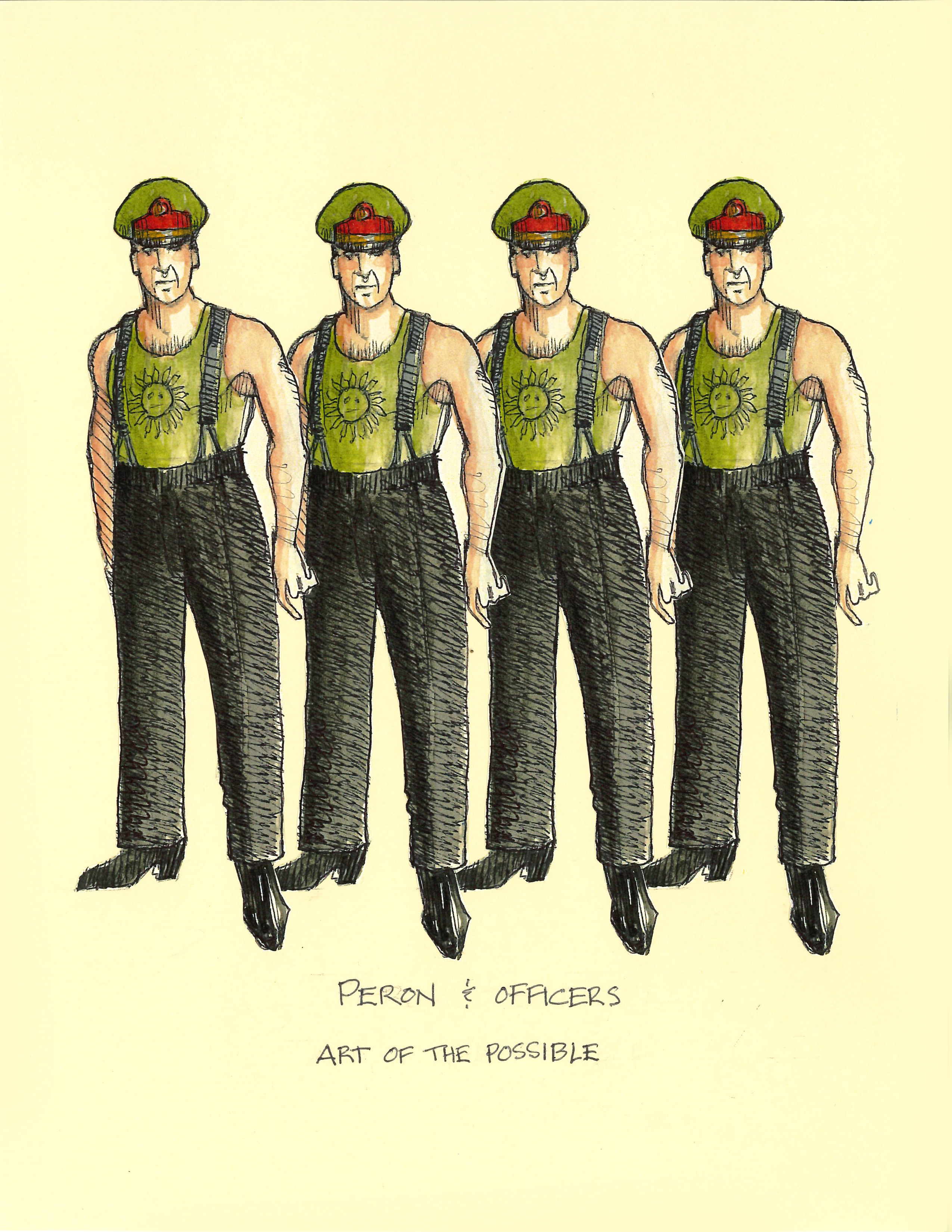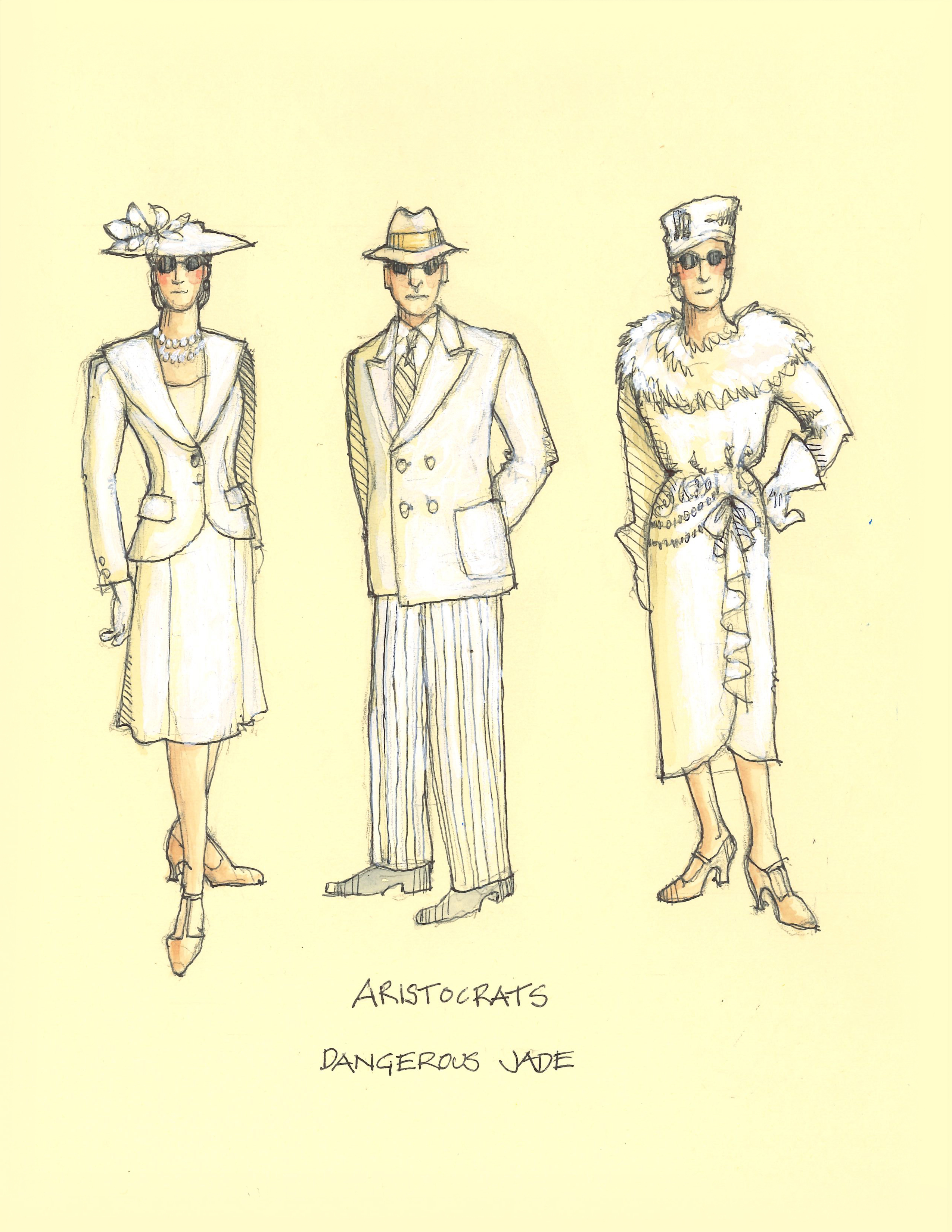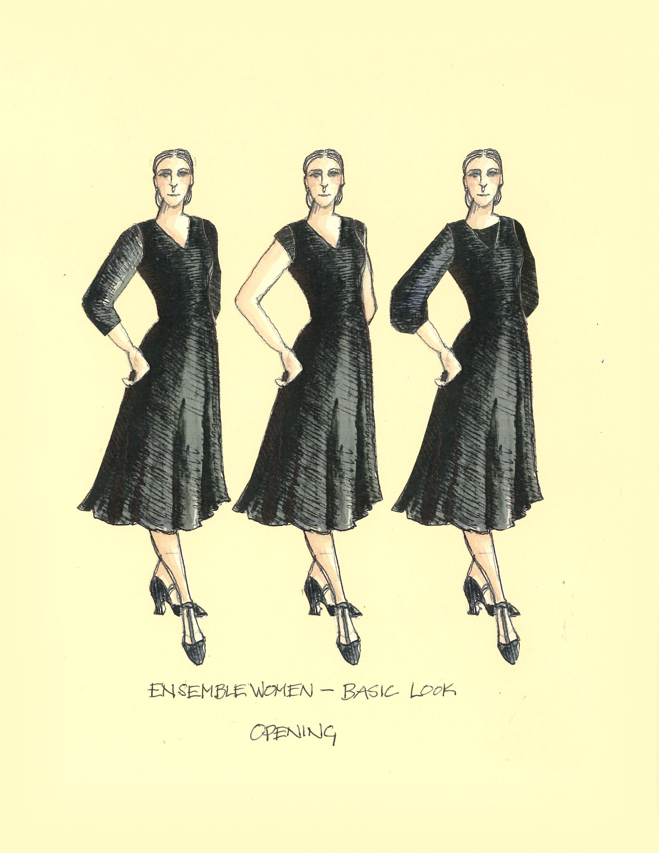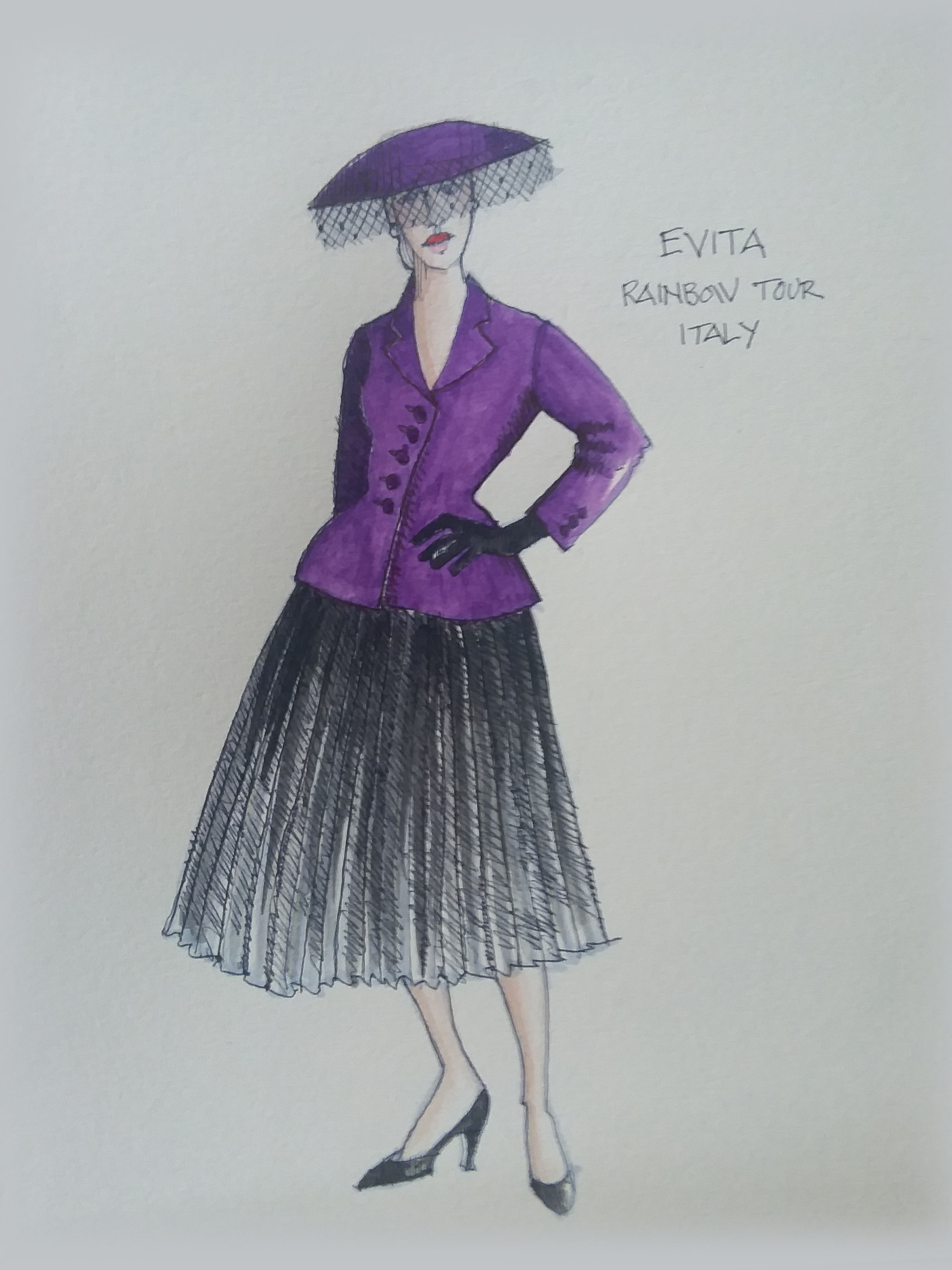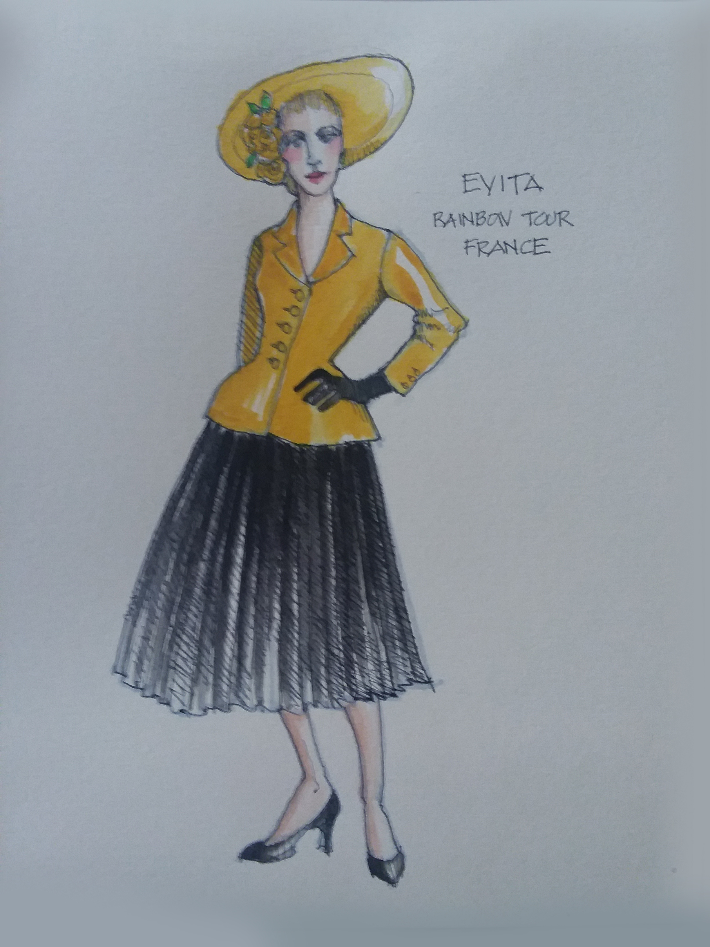 Director Marcia Milgrom Dodge set the opening and closing of Evita in an Argentine Tango Hall. The idea was to present the costumes in a theatrical way. The ensemble first appeared simply dressed in black dresses and black and white period menswear. We added various pieces to these basic costumes to create the different looks needed by the ensemble. The only full change the ensemble had was into all white looks to play the aristocrats. The Rainbow Tour was the most thrilling 5 minutes of my career- we built 4 Bar jackets and Eva changed colors a vista for each country: Red for Spain, Yellow for France, Violet for Italy, and Black for England.