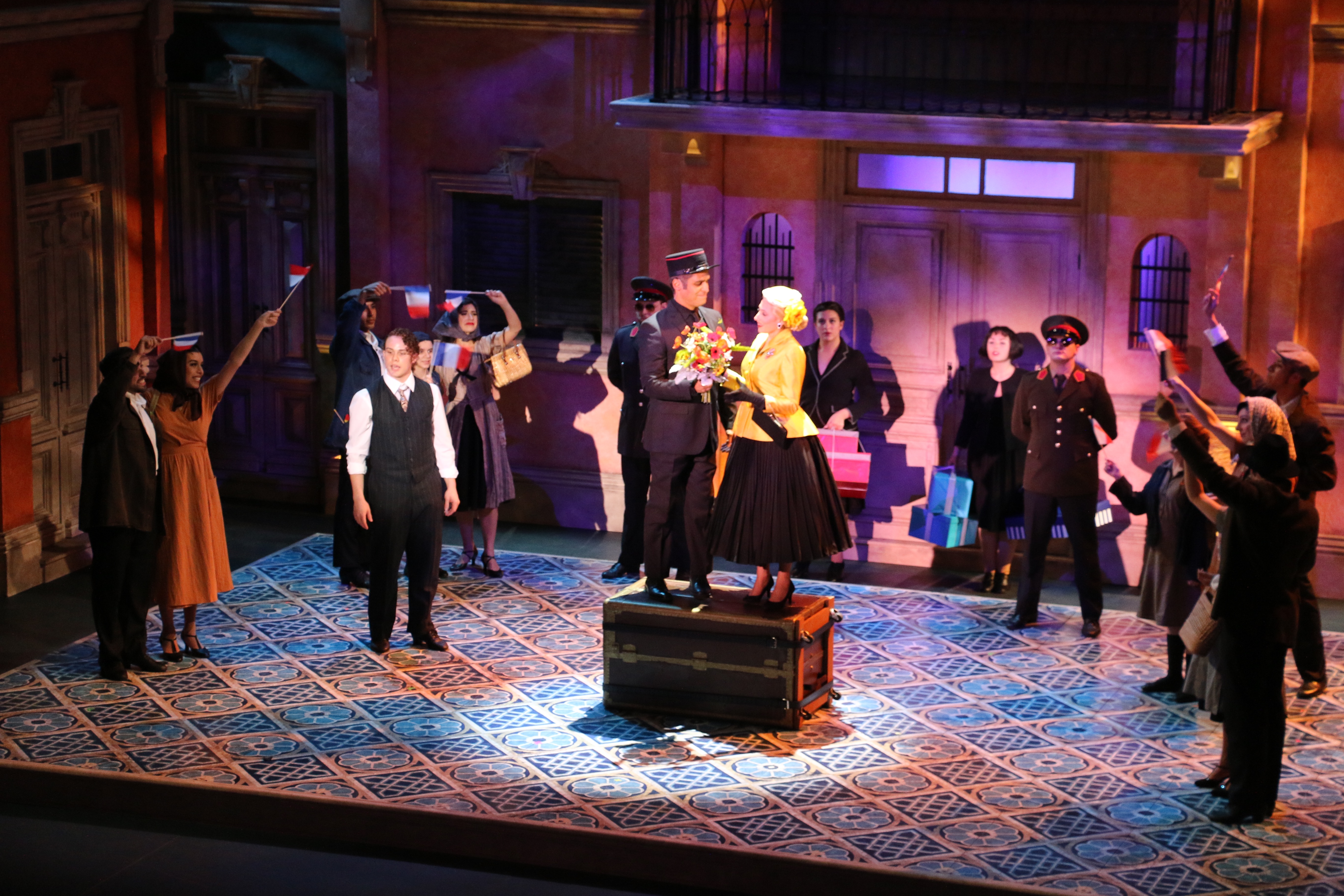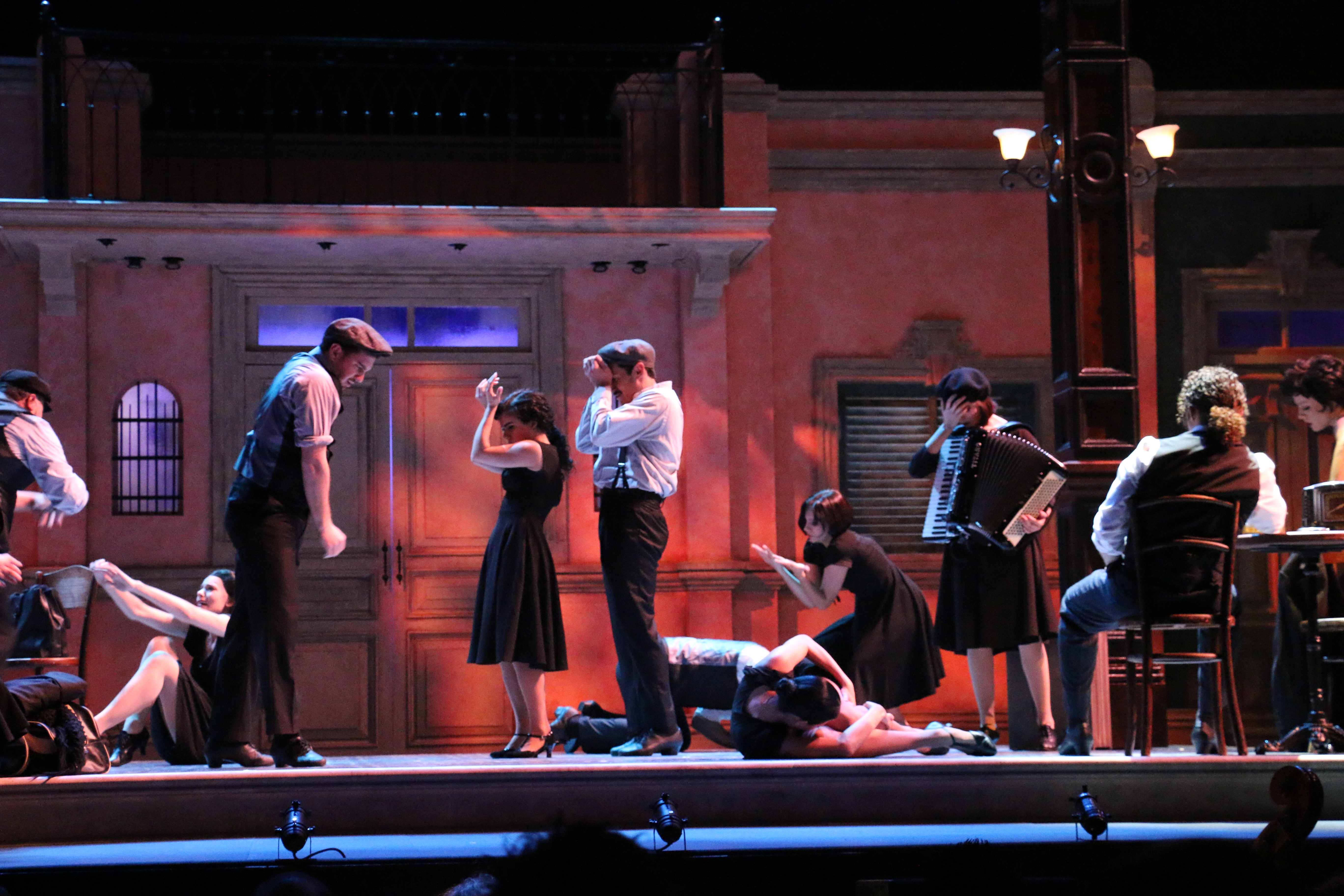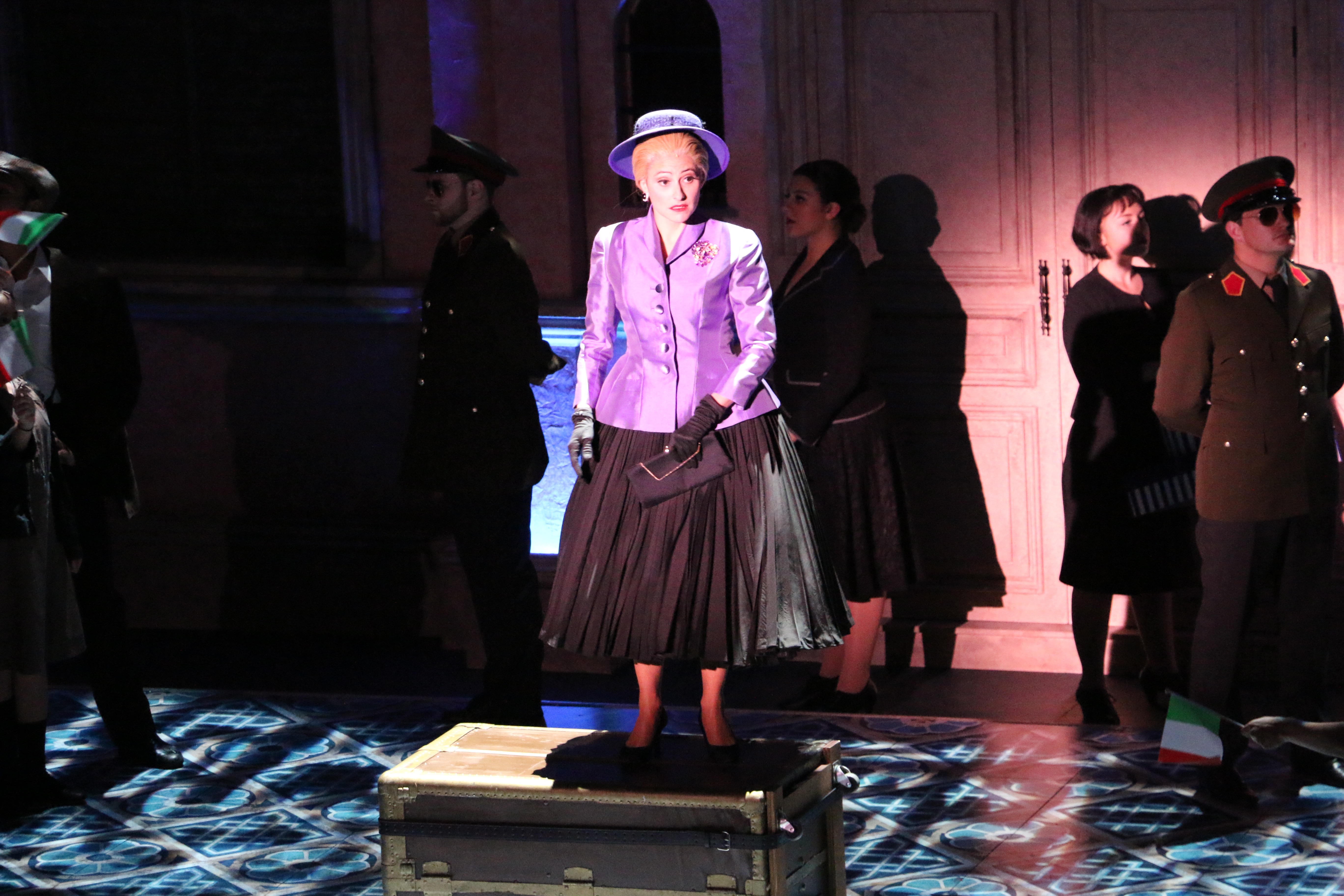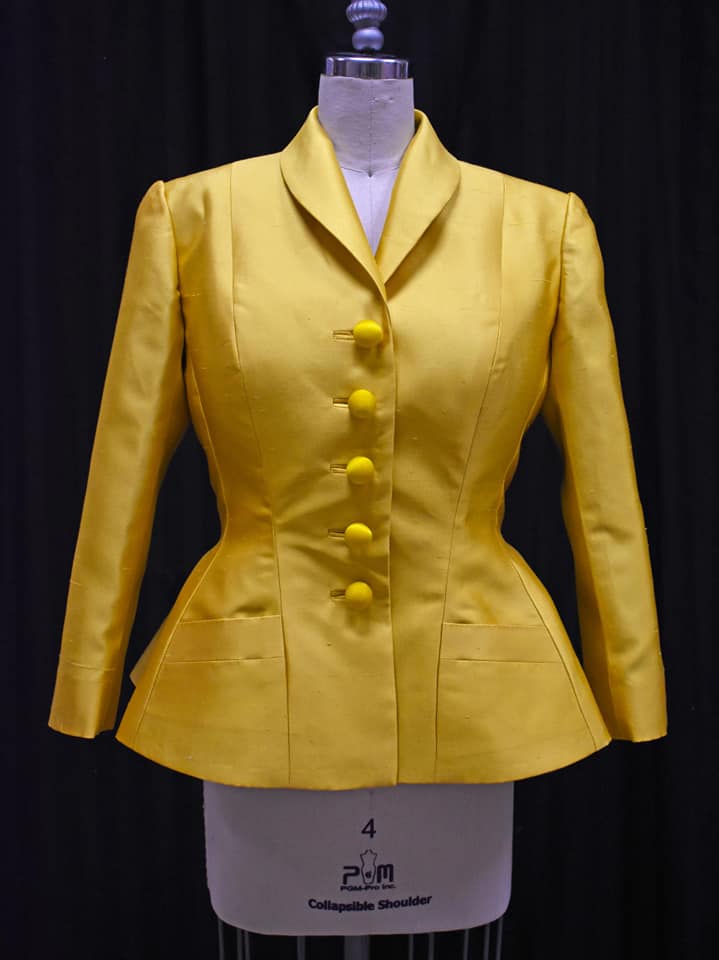 Director Marcia Milgrom Dodge set the opening and closing of Evita in an Argentine Tango Hall. The idea was to present the costumes in a theatrical way. The ensemble first appeared simply dressed in black dresses and black and white period menswear. We added various pieces to these basic costumes to create the different looks needed by the ensemble. The only full change the ensemble had was into all white looks to play the aristocrats. The Rainbow Tour was the most thrilling 5 minutes of my career- we built 4 Bar jackets and Eva changed colors a vista for each country: Red for Spain, Yellow for France, Violet for Italy, and Black for England.