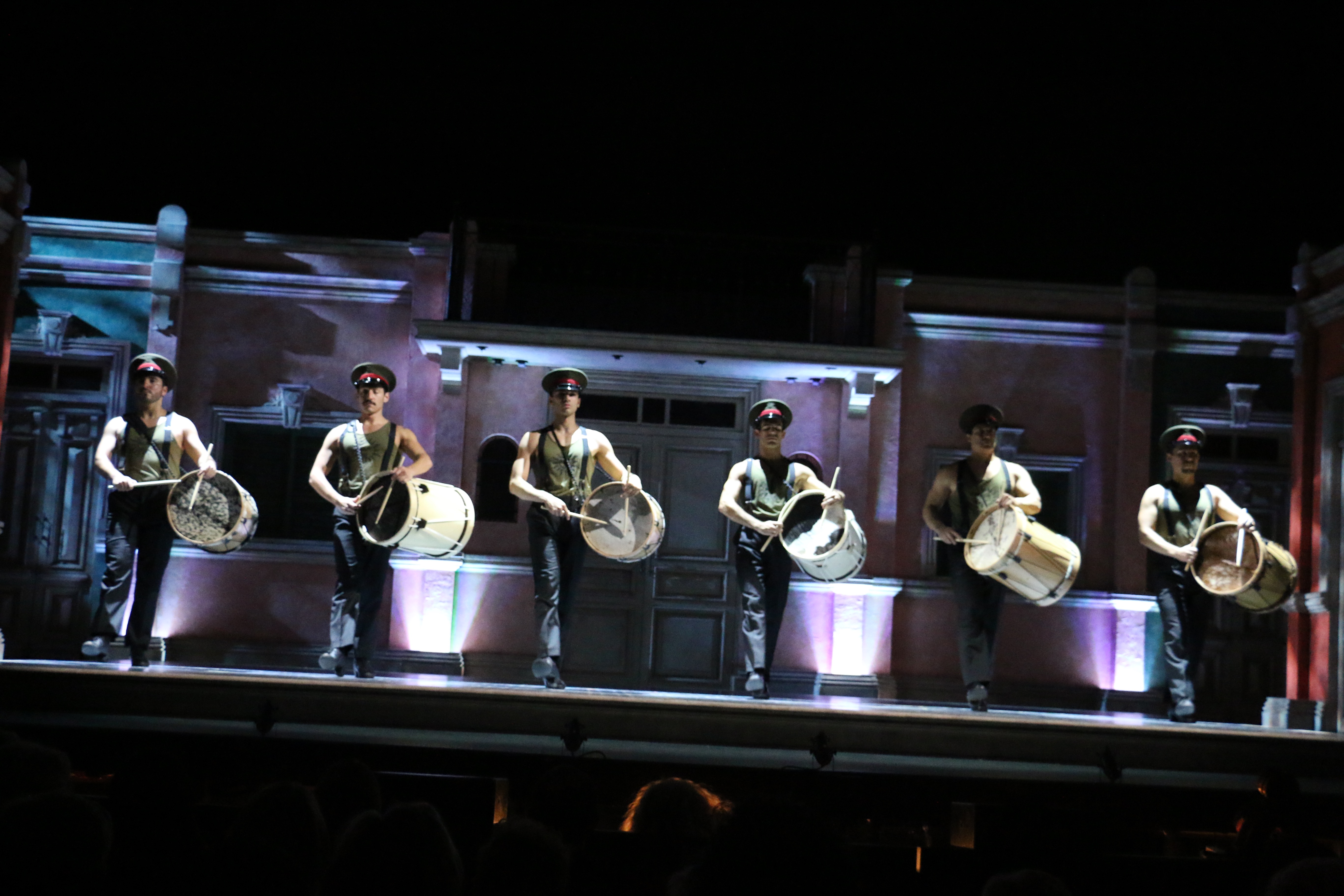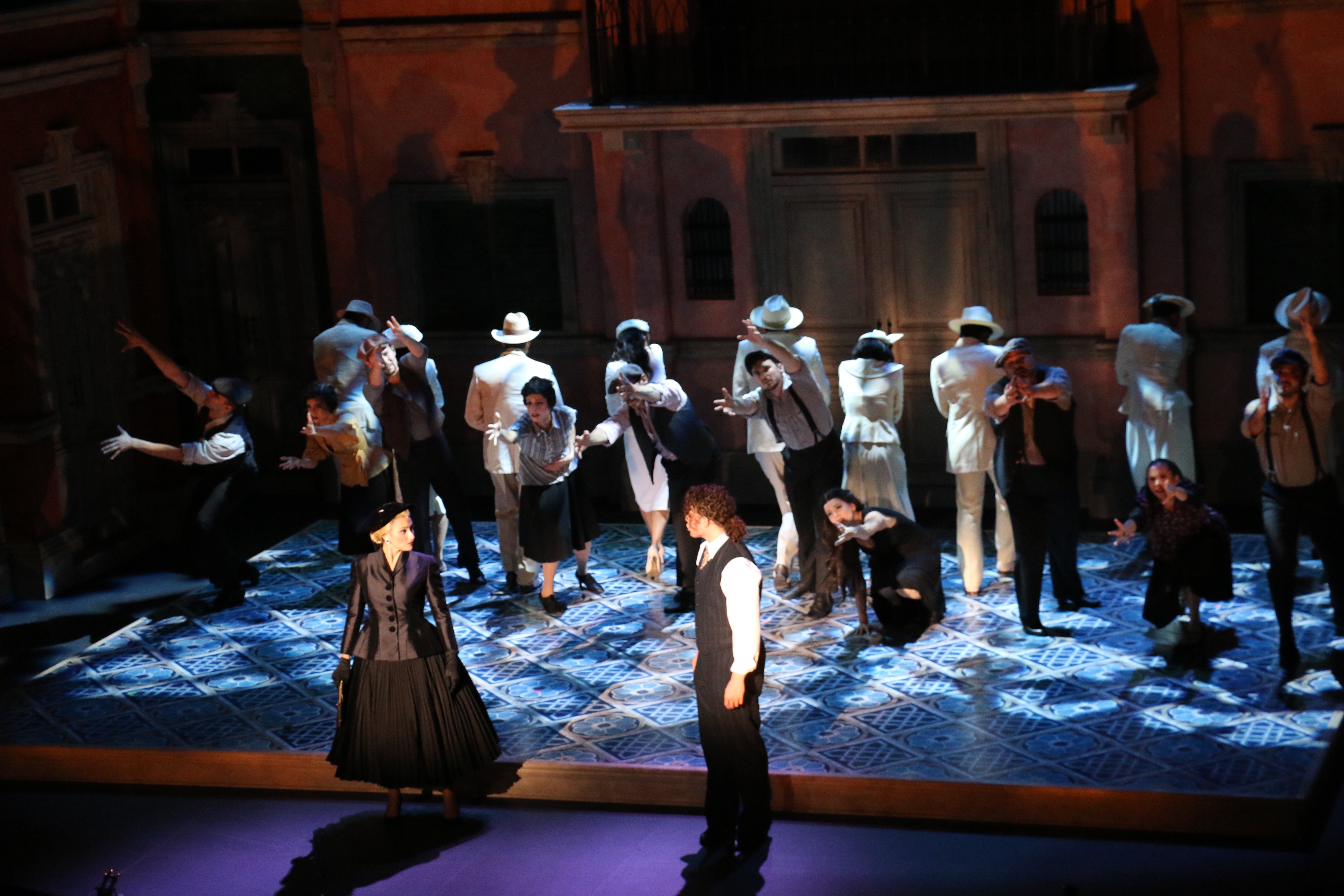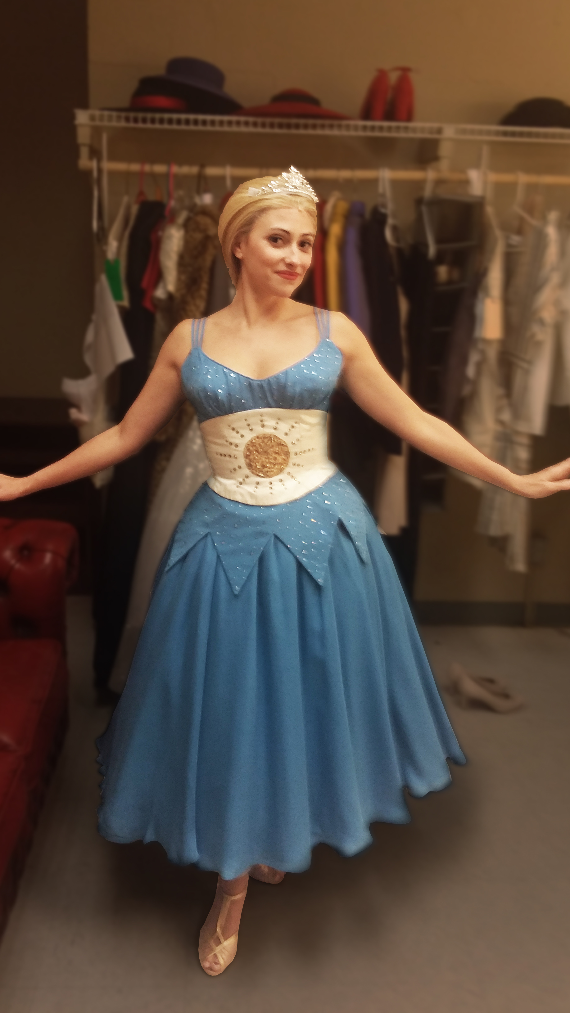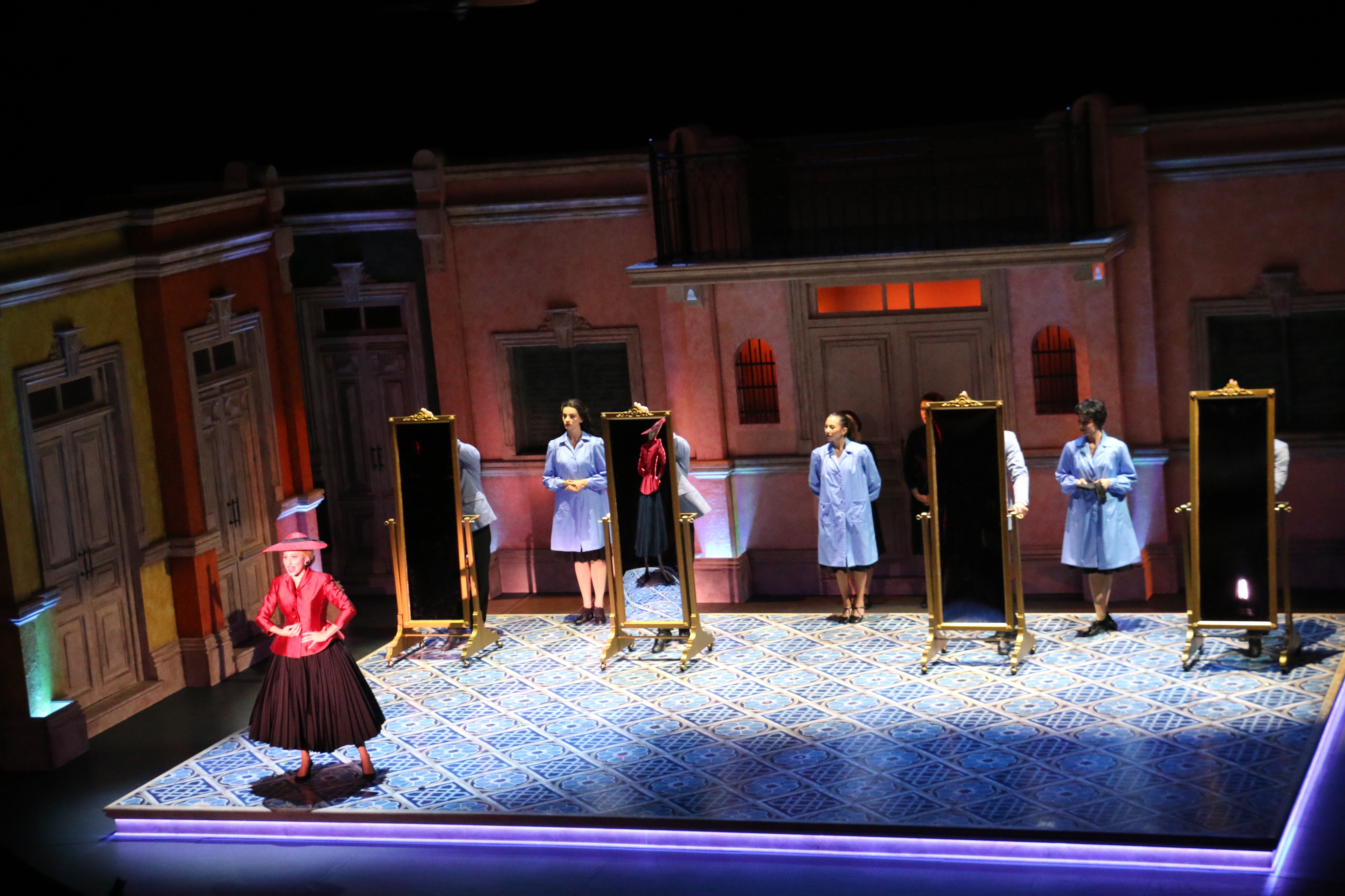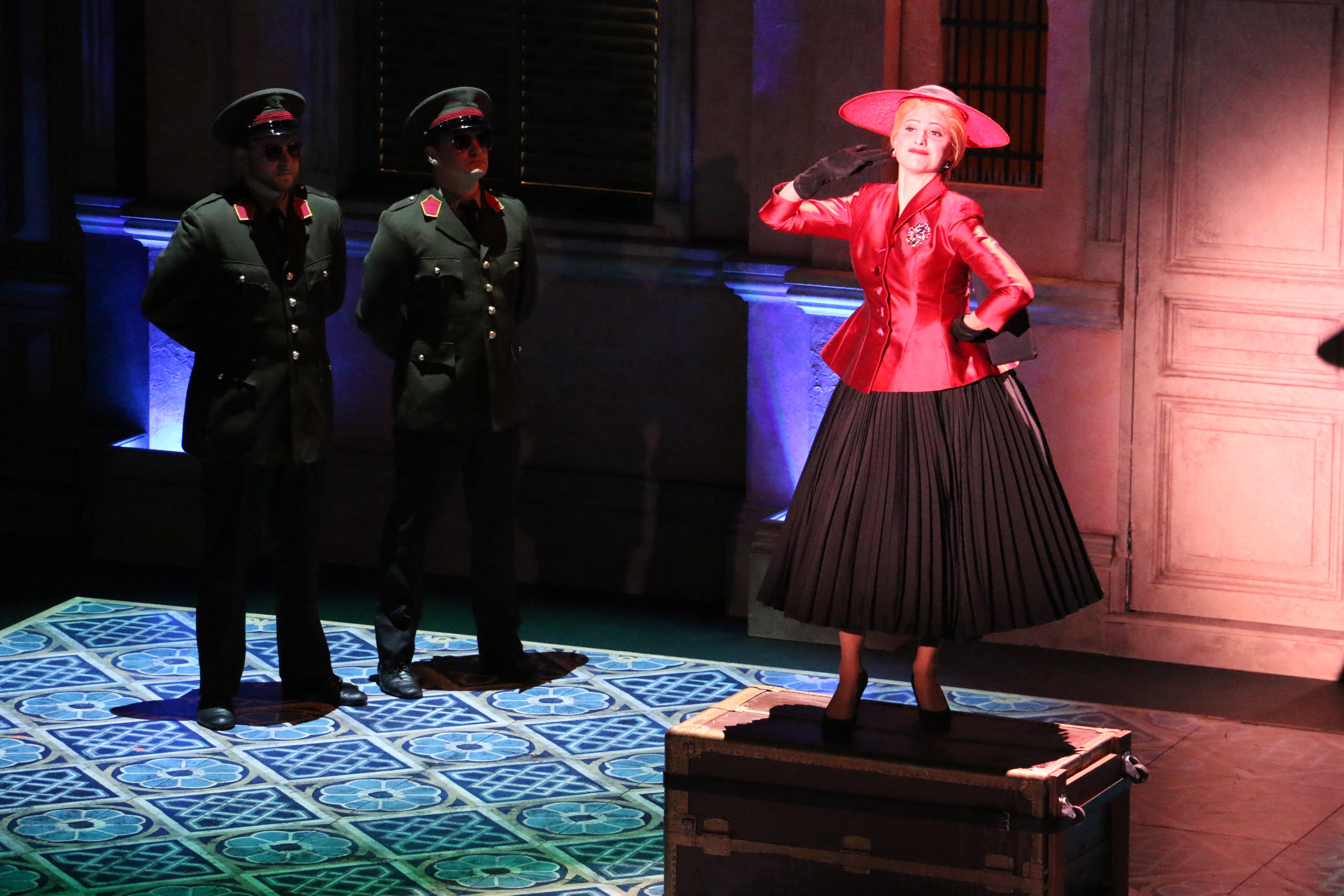 Director Marcia Milgrom Dodge set the opening and closing of Evita in an Argentine Tango Hall. The idea was to present the costumes in a theatrical way. The ensemble first appeared simply dressed in black dresses and black and white period menswear. We added various pieces to these basic costumes to create the different looks needed by the ensemble. The only full change the ensemble had was into all white looks to play the aristocrats. The Rainbow Tour was the most thrilling 5 minutes of my career- we built 4 Bar jackets and Eva changed colors a vista for each country: Red for Spain, Yellow for France, Violet for Italy, and Black for England.